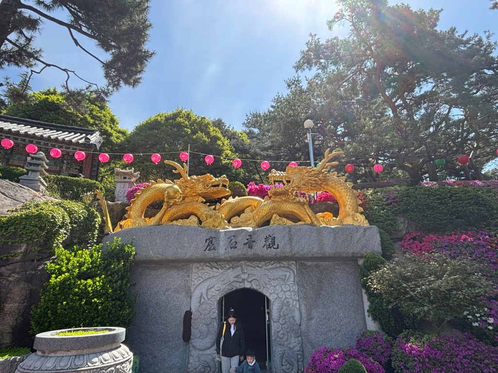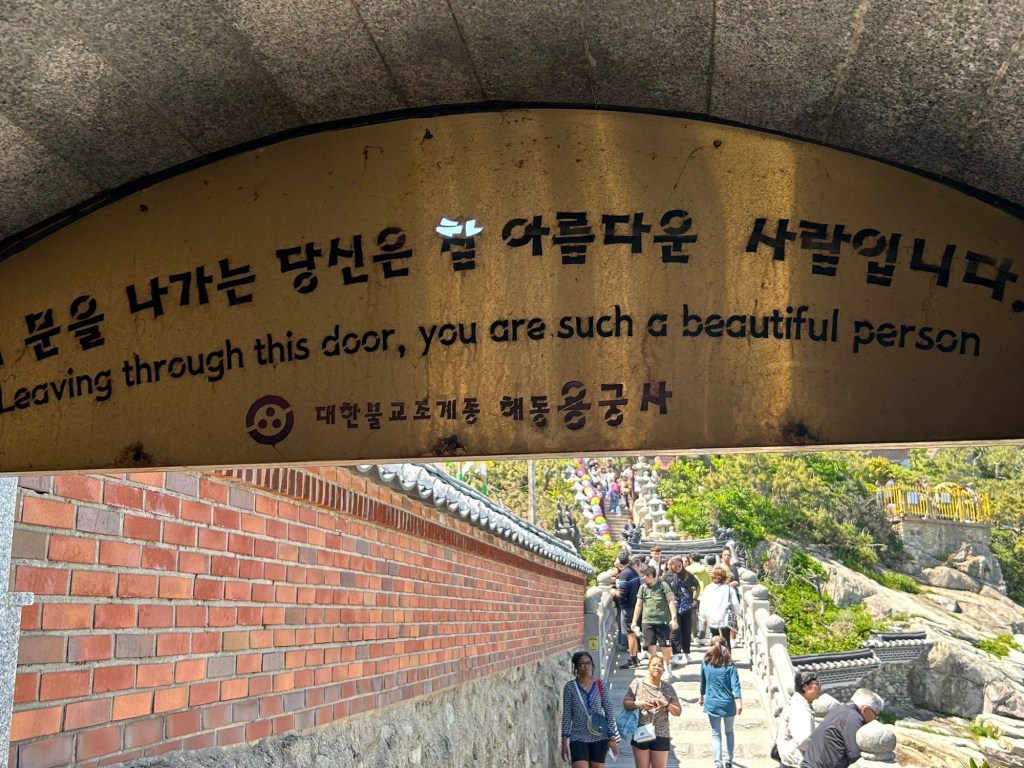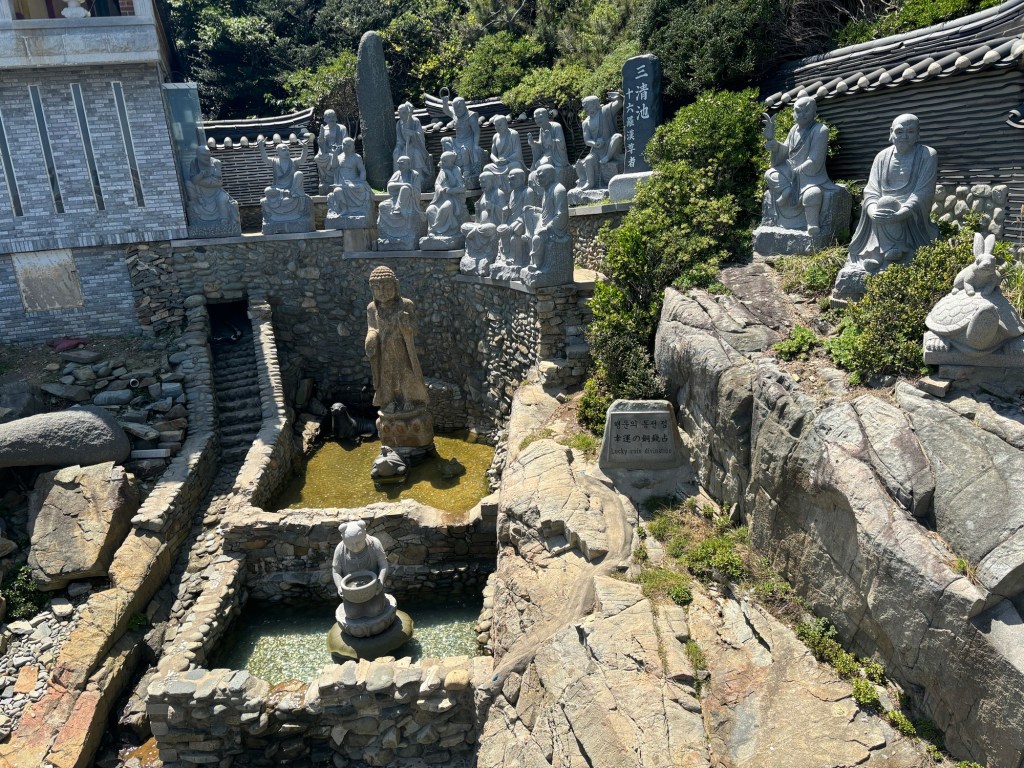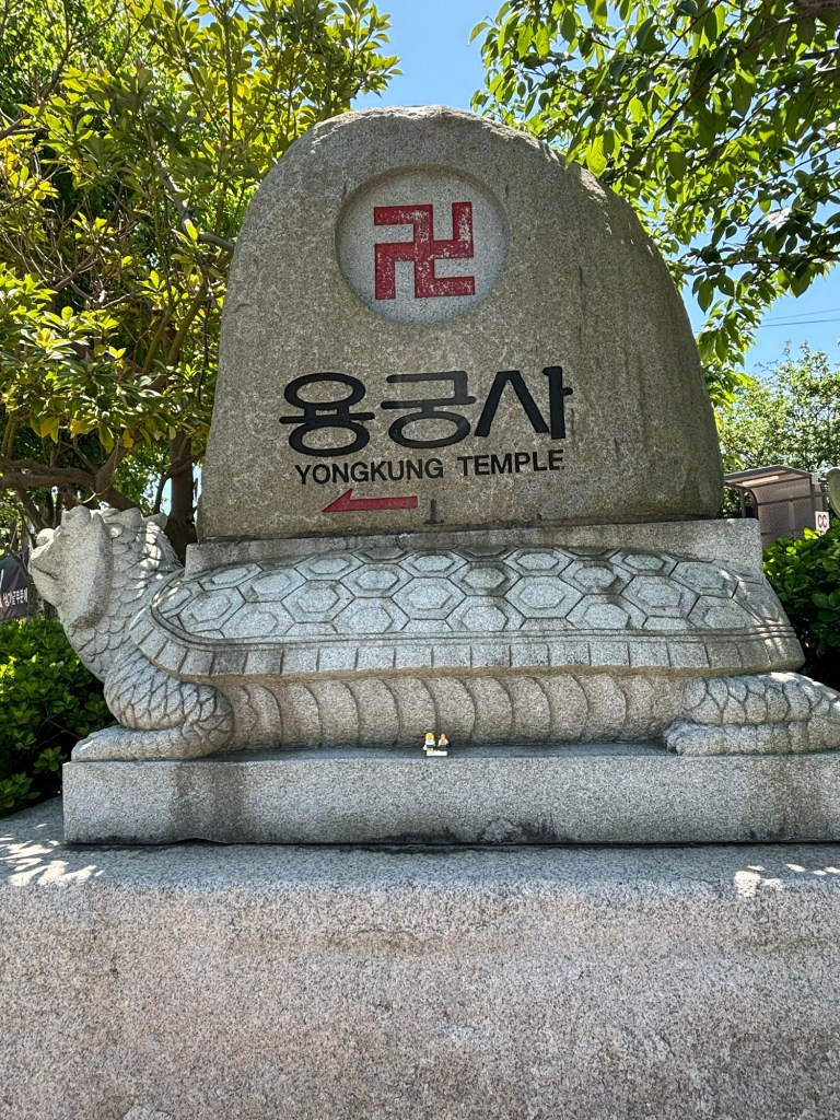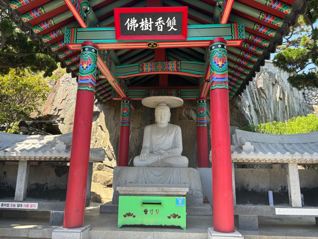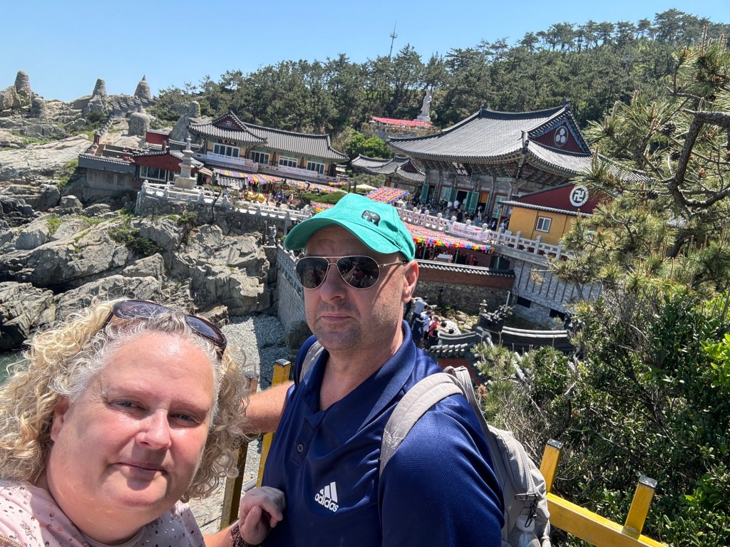 Gestern hat es ziemlich geregnet, deshalb haben wir den Tag für ein paar administrative Dinge genutzt, wie Bus und Bahntickets buchen und einen Besuch in einer Shopping Mall. Heute war das Wetter wieder schön und wir haben den Seokbulsa Tempel in den Bergen von Busan besucht. Es ist etwas schwierig den Tempel zu erreichen, da sollte eine Gondel hochfahren, aber die haben wir nicht gefunden. Also sind wir so weit wie möglich mit einem Taxi hochgefahren und den Rest gelaufen. Es war ziemlich steil, rutschig und nass, was ein kleines Problem für meinen Fuß war, aber wir waren vorsichtig und sehr langsam. Der Tempel ist wunderschön und ich bin froh, dass wir heute noch die Chance hatten ihn zu besuchen. Er ist teilweise in Stein gemeißelt und gebaut. Wunderschön!