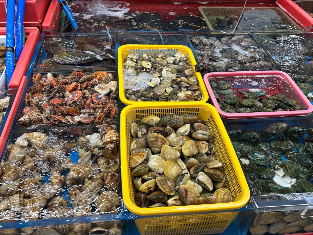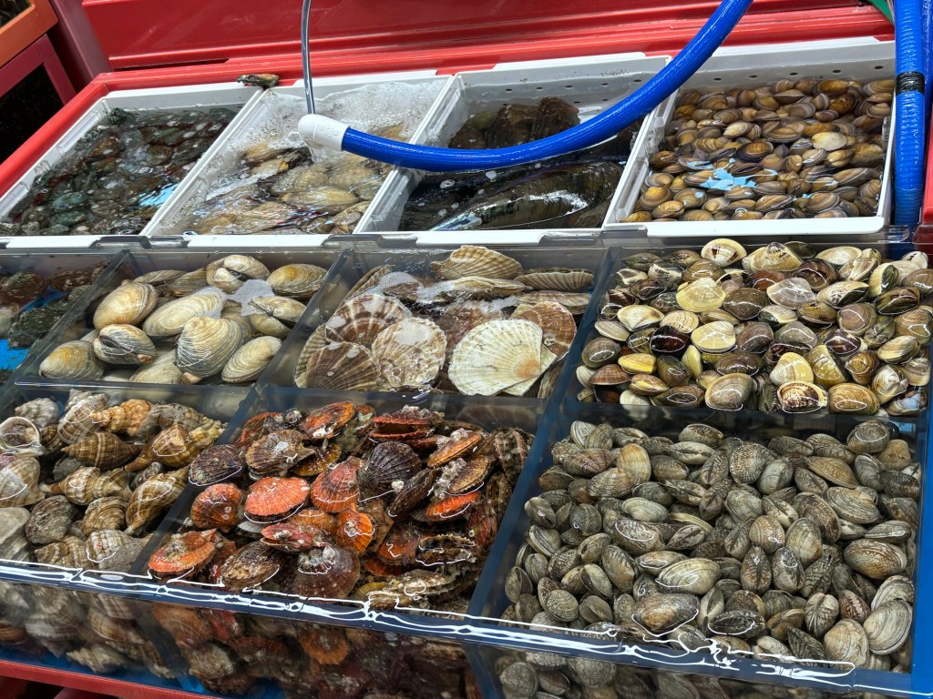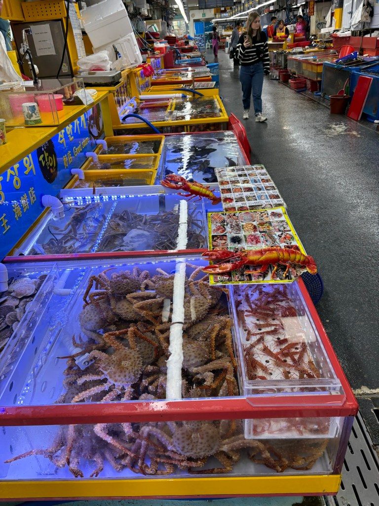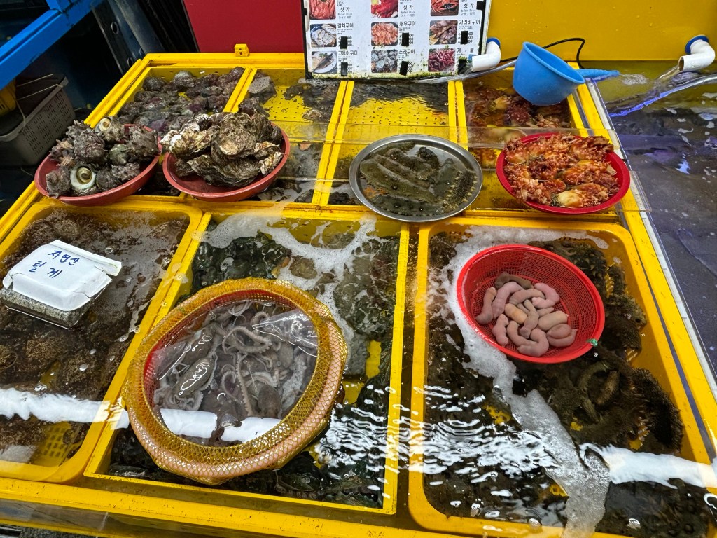 Am ersten Tag in Busan haben wir die nähere Umgebung erkundet. Nah zum Hotel ist u.a. der Jagalchi Fischmarkt. Im Erdgeschoss sucht man sich aus was man essen möchte und im ersten Stock wird es dann zubereitet! Nicht gekocht! Die Spezialität ist die Meeresfrüchte roh zu essen. Wir waren aber nicht so mutig. 😂