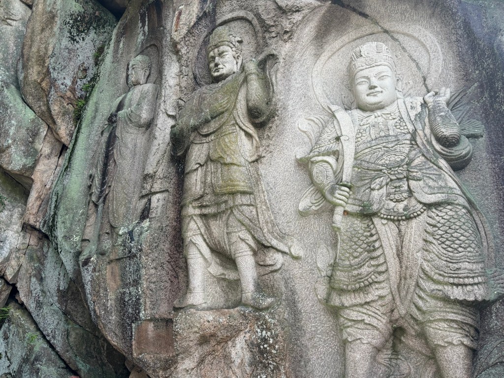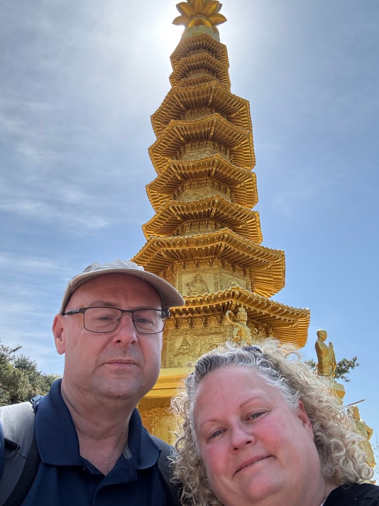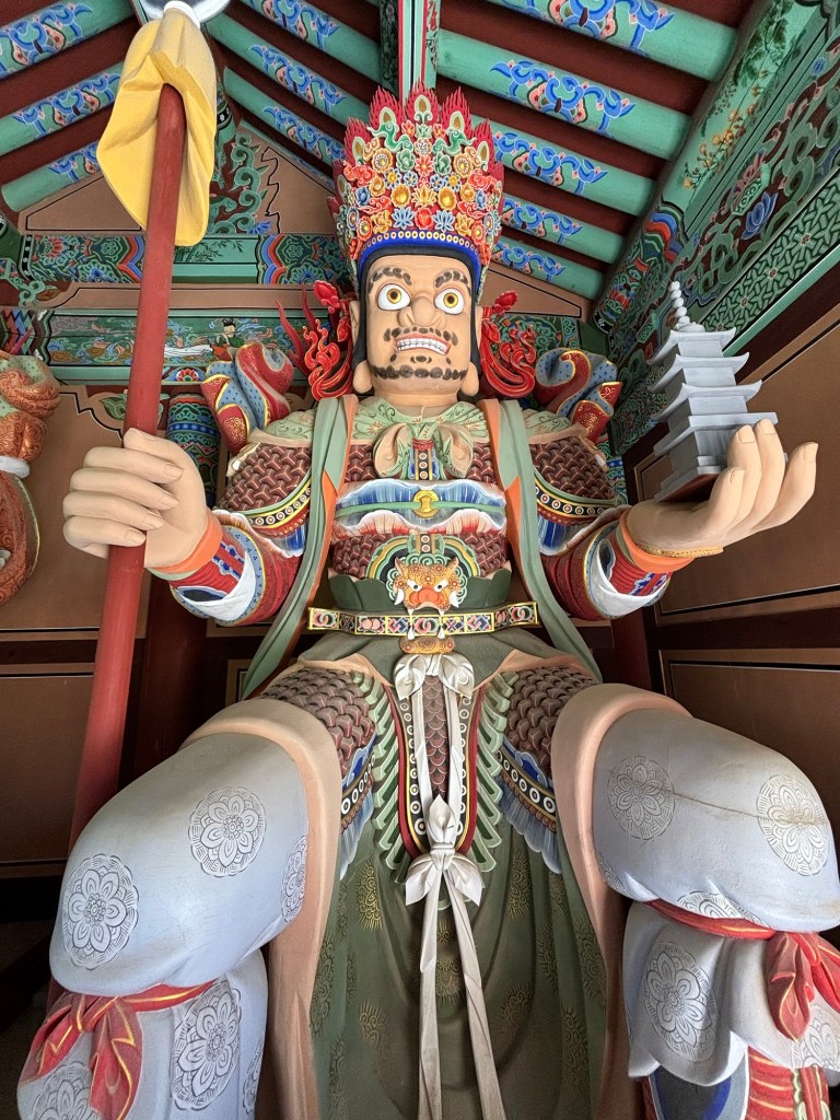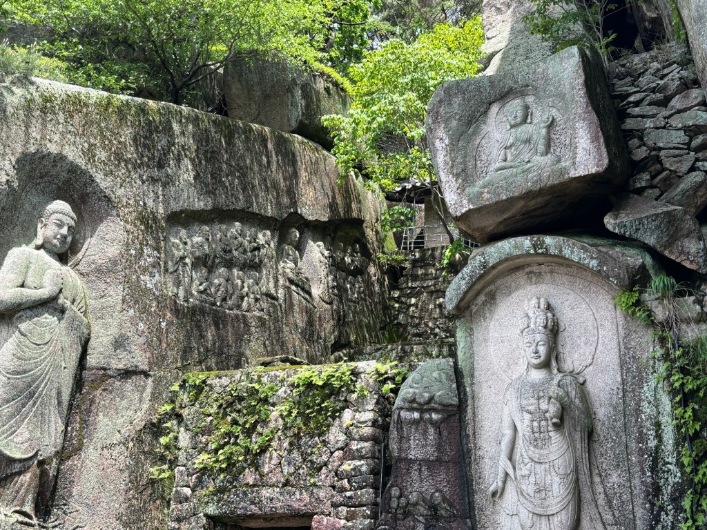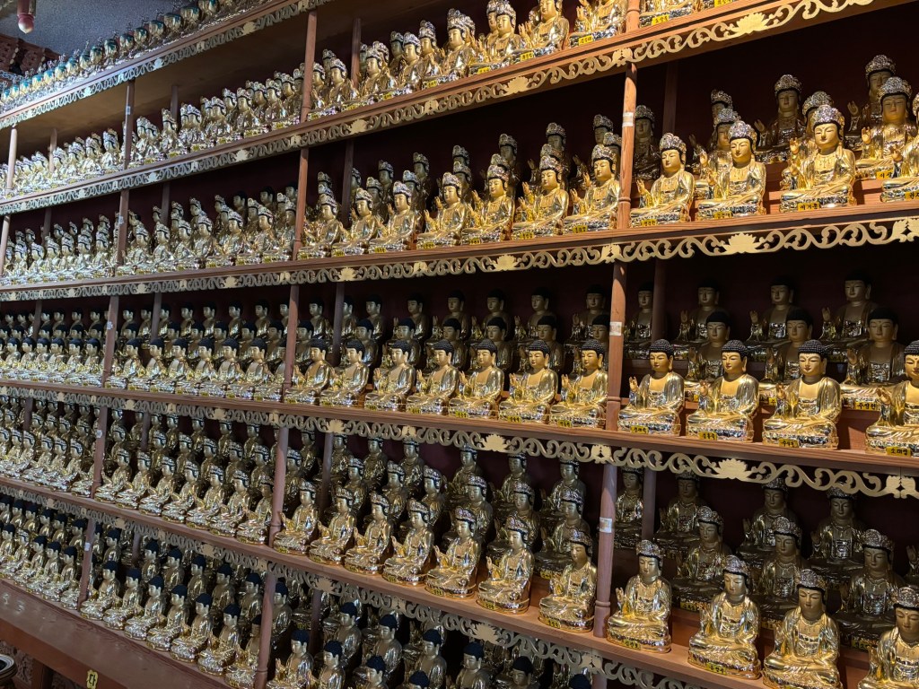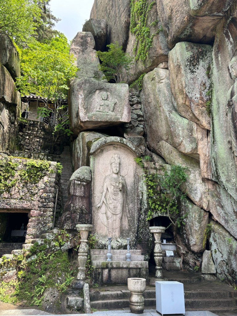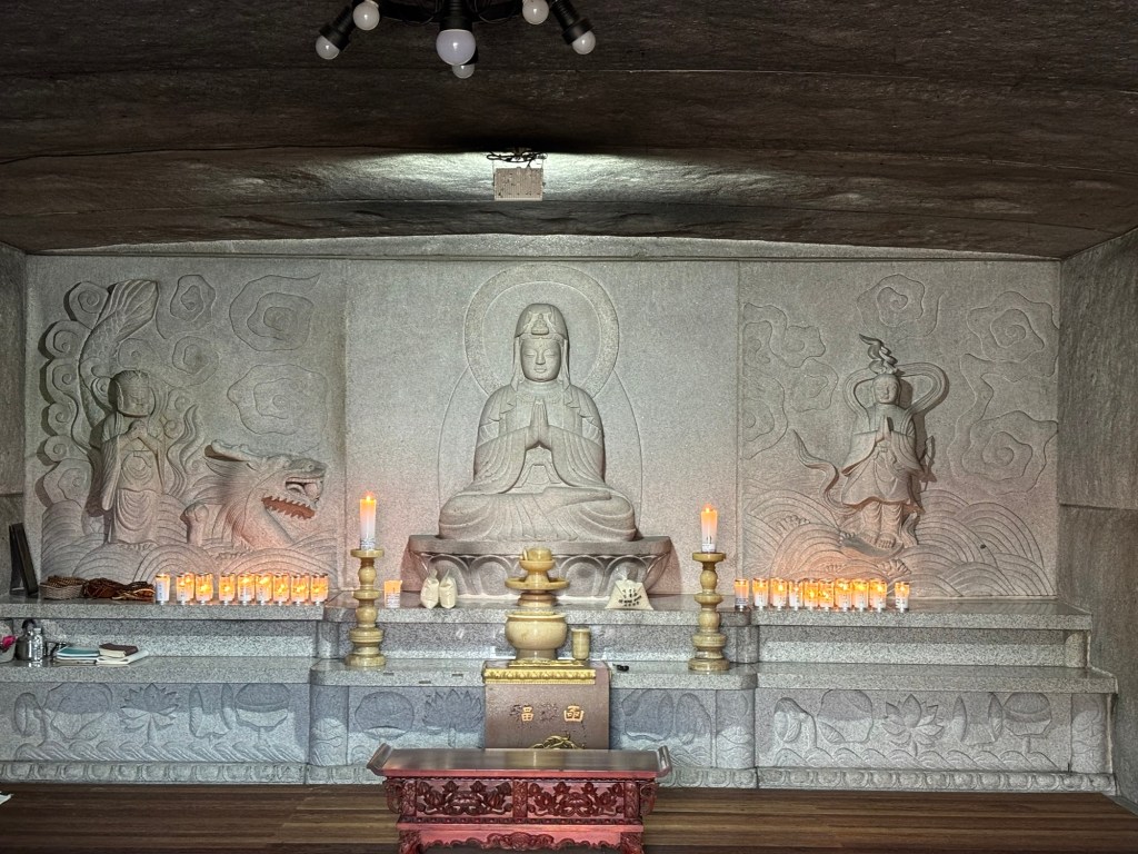 It was heavily raining yesterday so we did some administrative work, booked train and bus tickets and went to a shopping mall. Today it was beautiful weather again so we did go and see Seokbulsa temple. Up in the Busan Mountains. It’s quite hard to get there, there should be a cable car going up, but we didn’t find it, so we took a taxi as far as we could and walked the rest. It’s quite steep, slippery and wet, which was a real problem with my foot. But we were careful and took our time. The temple itself is beautiful and I am happy we took the chance to go and see it today. It’s built and carved in the mountain. Beautiful!