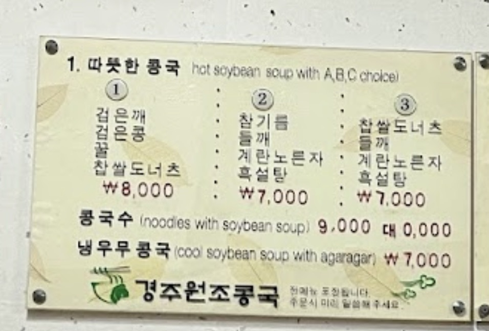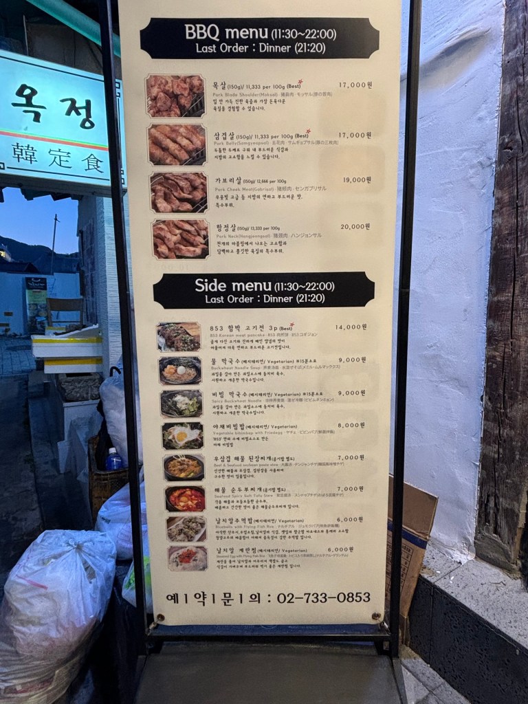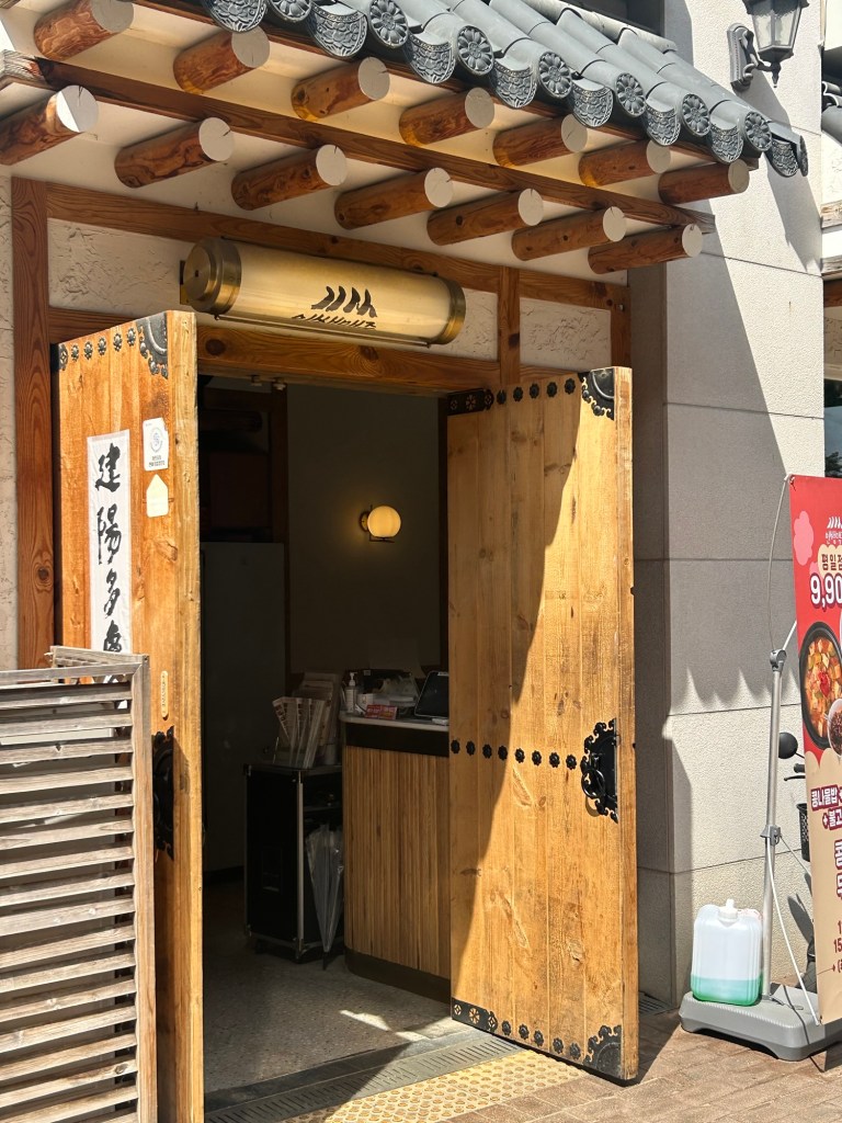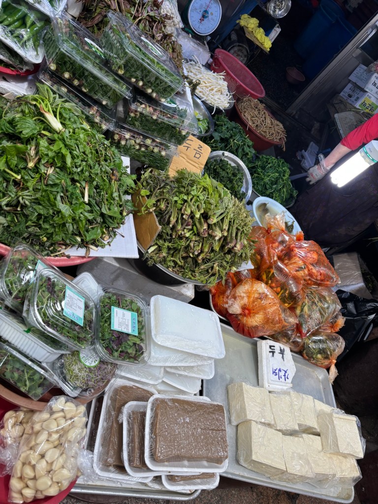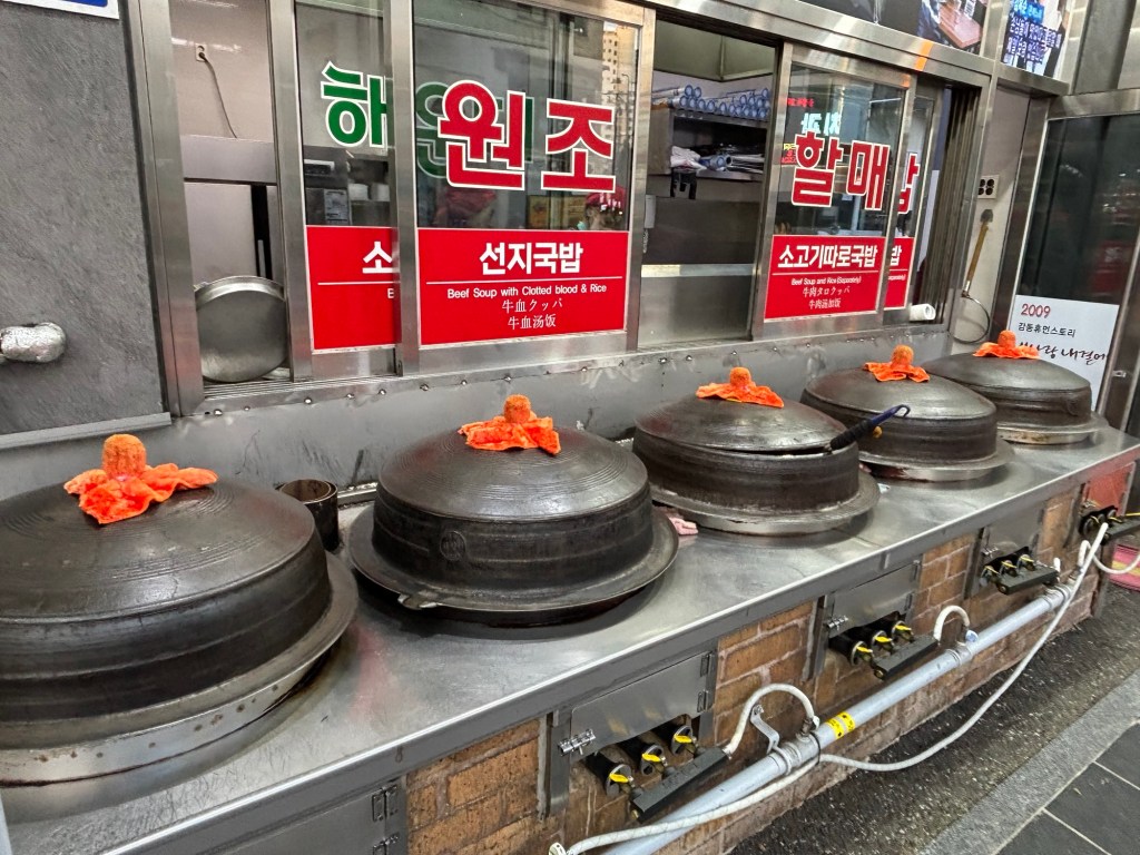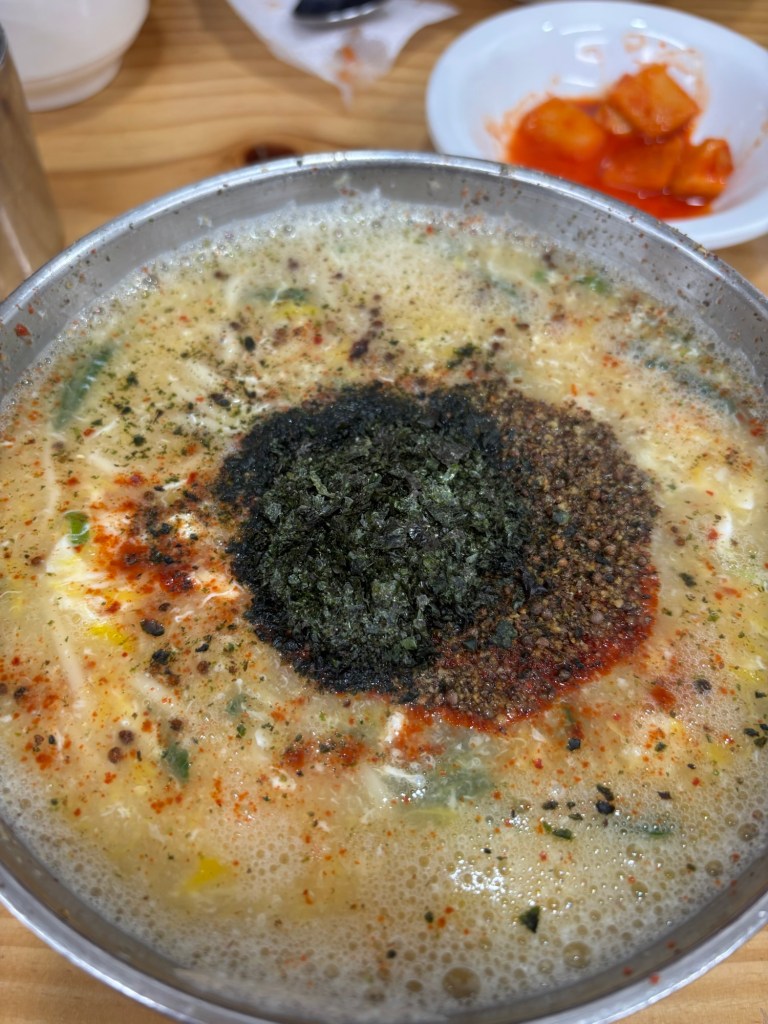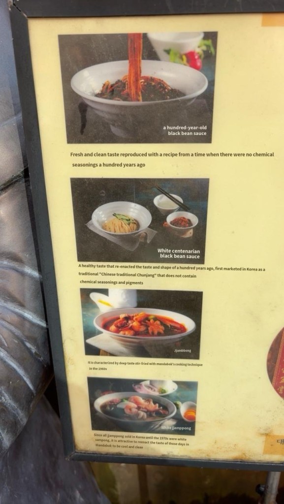 The restaurant was full of Koreans. So we thought we should give it a try. You even had to take your shoes off before entering the restaurant. Only five options on the menu. All soybean soup with something. We chose option 1 – soy bean soup with black sesame. 2 would have been with oil and egg yolk, 3 with perilla seeds and we already figured out we don’t like them. To be fair, it wasn’t inedible, but it also wasn’t that good that we would order it again… as lunch – breakfast maybe.. or rather not again. 😂 It was just a sweet taste and a glibbery, gluey consistency we’re not used to. But I am glad we tried it.