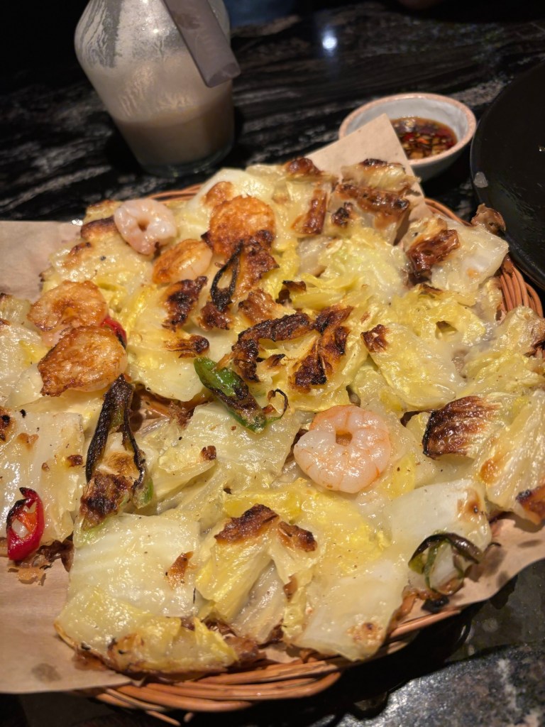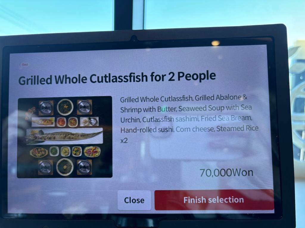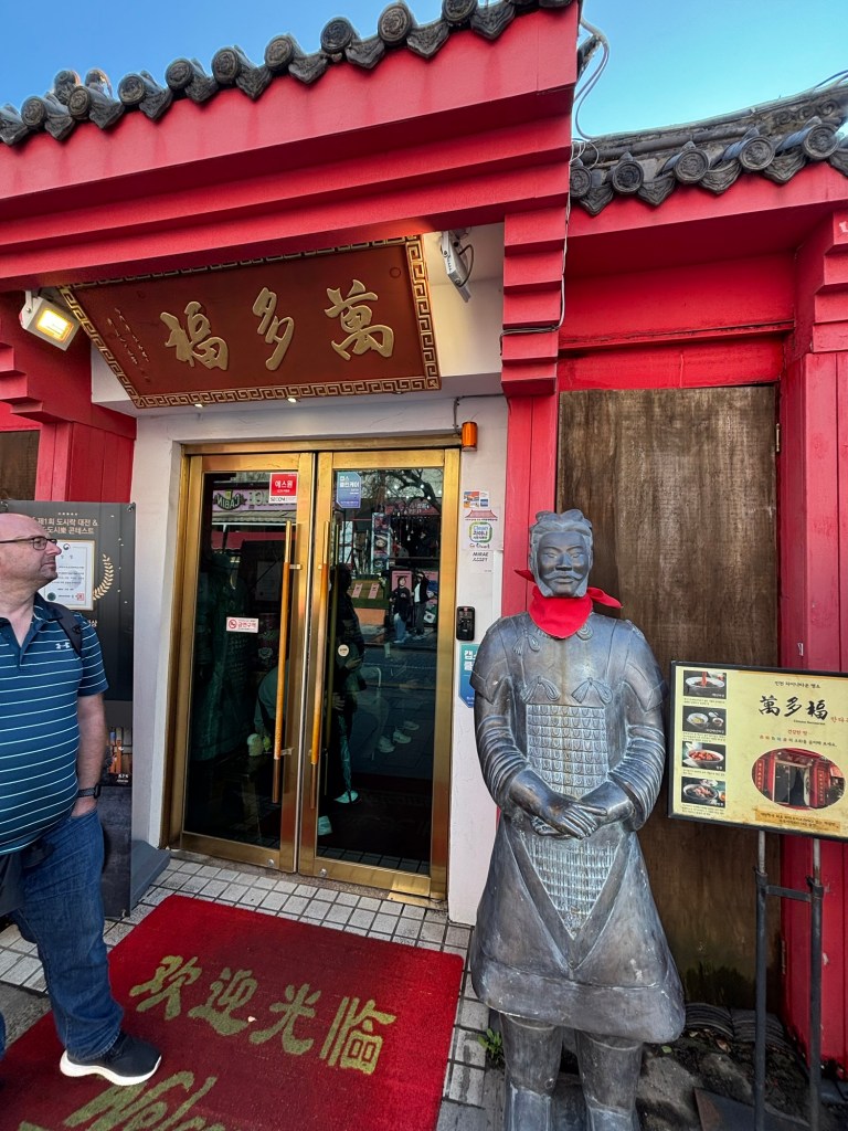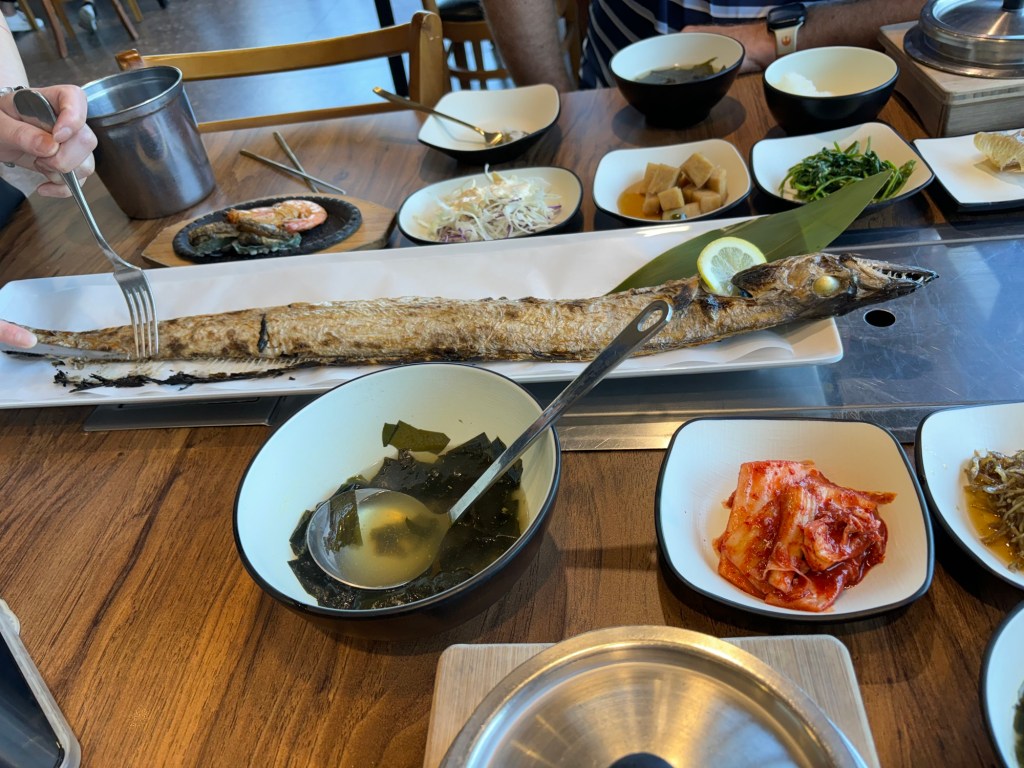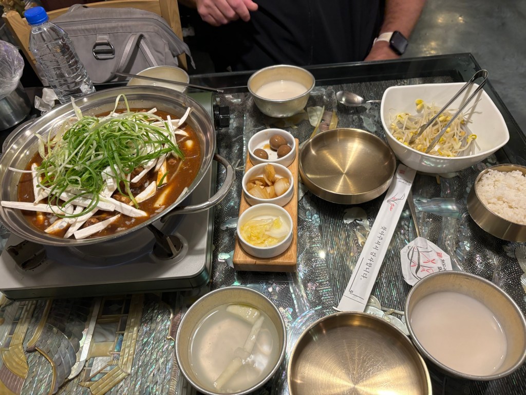 Das Restaurant war voll mit Koreanern, also dachten wir, das probieren wir. Man musste sogar seine Schuhe ausziehen bevor man das Restaurant betrat. Typisch Koreanisch. Es gab nur 5 Gerichte zur Auswahl, alle Sojabohnensuppe mit irgendwas drin. Wir haben uns für Option 1 entschieden. Sojabohnensuppe mit schwarzem Sesam. 2 wäre mit Öl und Eigelb gewesen. 3 mit Perilla Samen und da wussten wir bereits, dass wir diese nicht mögen. Um ehrlich zu sein, es war nicht ungenießbar. Es war aber auch nicht so gut, dass ich es nochmal bestellen würde… als Mittagessen – evtl. als Frühstück… oder lieber überhaupt nicht mehr. 😂 Es hatte einen süßen Geschmack und die Konsistenz wie glibberiger Kleber. Etwas das für unseren Geschmack sehr ungewöhnlich ist. Aber ich bin froh, dass wir es probiert haben.