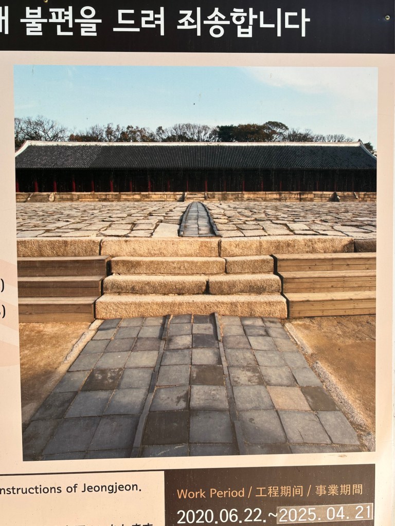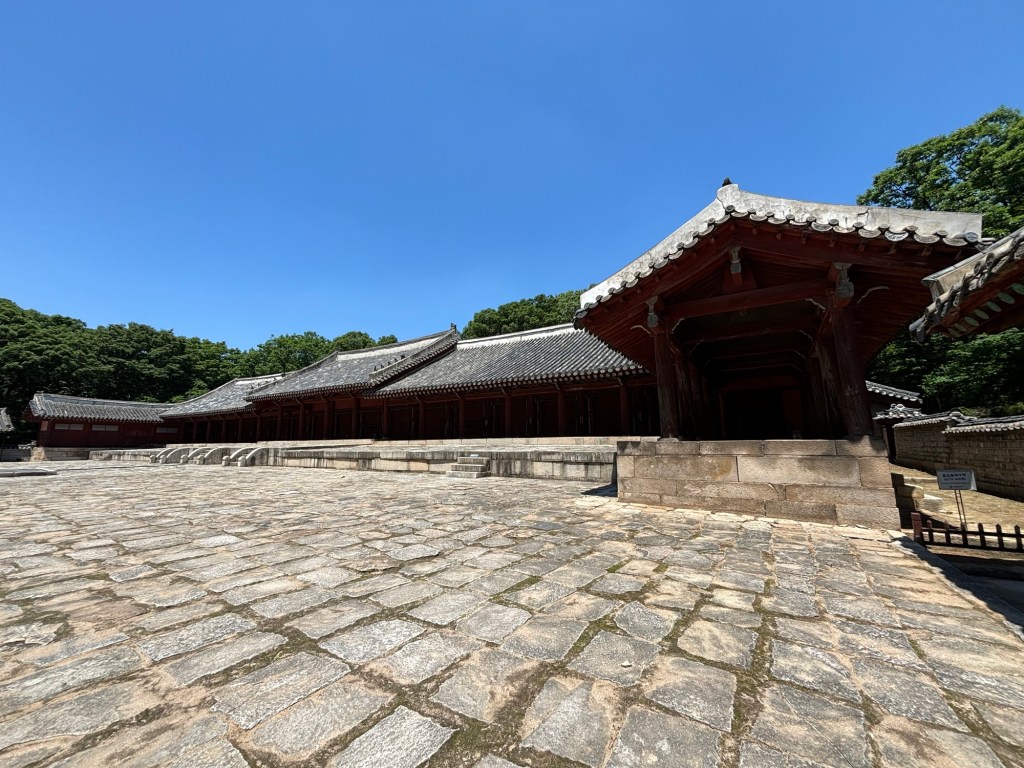 Jeongjeon, the main hall, attained its present scale with 19 spirit chambers housing 49 spirit tablets. 19 doors with 19 spirits of the kings and their 30 queens.