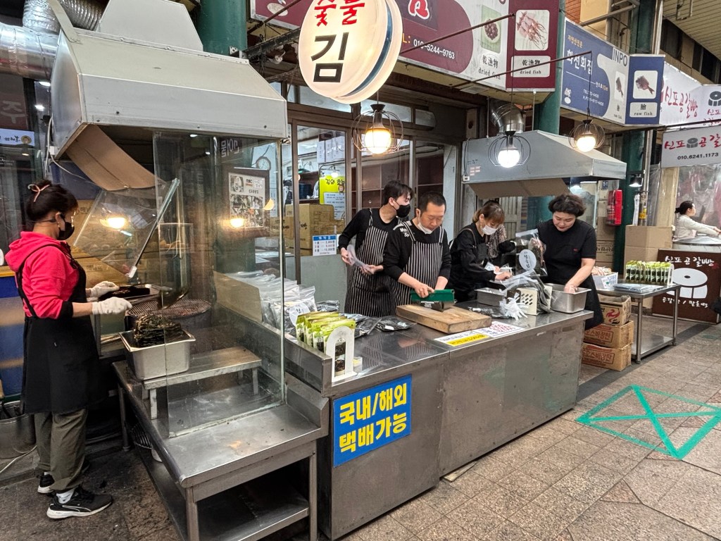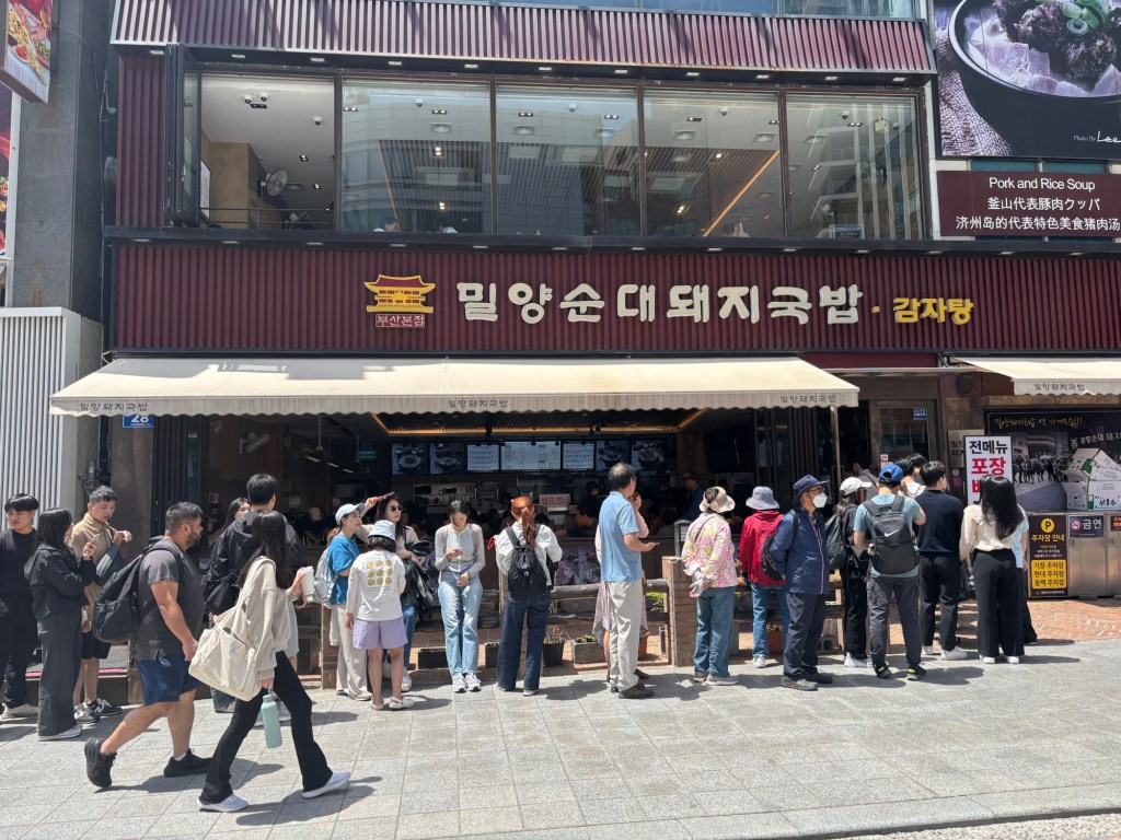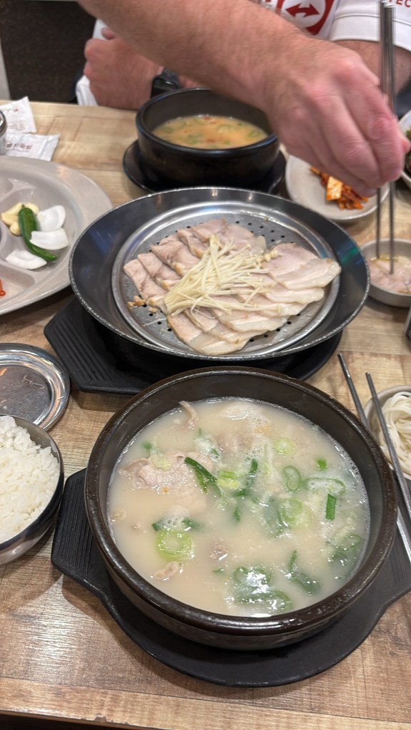 Wir wollten unbedingt die berühmte Busan Suppe Dwaejigukbap essen und sind auf dieses Restaurant auf der Hauptstraße in Haeundae gestoßen. Normalerweise gehen wir nicht in die Hauptstraßen Restaurants, wir bevorzugen die lokalen, kleinen in Seitenstraßen. Aber wir sind froh, dass wir eine Ausnahme gemacht haben. Vor dem Lokal ist immer eine lange Schlange von Koreanern. Auch Berühmtheiten haben dort schon gegessen. Und wir hatten die beste Dwaejigukbap Suppe jemals, besser als die Michelin Star in Seoul. Dwaejigukbap ist eine simple Schweineknochen Suppe, diese wird 48 Stunden langsam gekocht bis eine cremig weiße Konsistenz entsteht. Die Suppe kommt komplett ungewürzt, so kann man sie an seinen persönlichen Geschmack anpassen. Sie kommt mit Schweinefleisch und Frühlingszwiebeln in der Suppe und Reis auf der Seite. Und natürlich Banchan. Man kann auch Bossam dazu bestellen, das ist gekochter Schweinebauch. 😋
